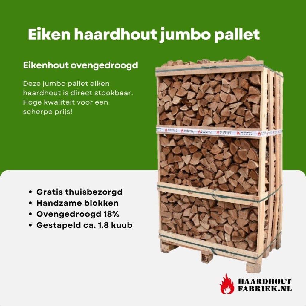 Ons eiken haardhout JUMBO pallet wordt geleverd met een vochtgraad van minder dan 20%, dit zorgt ervoor dat uw haardhout direct bruikbaar is en optimaal zal stoken. Zo is het zo dat er veel minder rook vrijkomt, bij het gebruik van droog haardhout. Onze blokken zijn 25 centimeter waardoor de haardhoutblokken perfect passen in iedere houtkachel of haard.