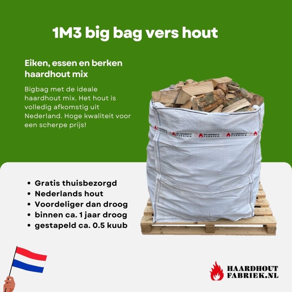 Onze 1 kuub haardhout biedt een praktische oplossing voor wie houdt van afwisseling en gemak. Onze 1m3 is gevuld met de meest bekende houtsoorten, Eiken, Essen & Berkenhout. De verhoudingen kunnen per bigbag verschillen. Let er wel goed op dat het hout vers is! Dit betekent dat het hout op moment van ontvangen niet perfect is om te stoken. Wij raden aan om het hout eerst nog te bewaren tot het droog is, gemiddeld is hier 1 jaar droogtijd voor nodig. Dan pas kunt u genieten van een optimaal haardvuur.